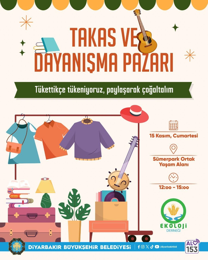 K21 Haber – Tüketim kültürünün getirdiği israfa dikkat çekmek ve paylaşım bilincini yaygınlaştırmak amacıyla Diyarbakır Büyükşehir Belediyesi ve Ekoloji Derneği iş birliğinde önemli bir etkinlik hayata geçiriliyor. "Tükettikçe tükeniyoruz, paylaşarak çoğaltalım" mottosuyla düzenlenecek olan 'Takas ve Dayanışma Pazarı', vatandaşları ellerindeki ürünleri başkalarıyla takas etmeye davet ediyor.