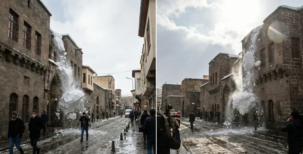 (DİYARBAKIR - ÖZEL HABER) — Diyarbakır’ı etkisi altına alan tarihi kar yağışı yerini yağmurlu ve nispeten ılık bir havaya bıraktı. Ancak bu hava değişimi, çatılarda biriken kar ve buz kütlelerini adeta birer "saatli bombaya" dönüştürdü. Gece saatlerinde eksi derecelerde donan, gündüz ise yağmur ve lodosun etkisiyle ağırlaşan kar kütleleri, yerçekimine yenik düşerek metrelerce yüksekten aşağı iniyor.