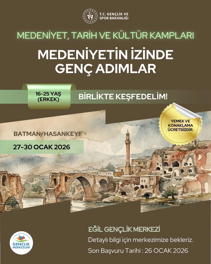 Projenin ilk ayağında Eğil Gençlik Merkezi, erkek gençleri tarihin sıfır noktalarından birine götürüyor. 16-25 yaş aralığındaki erkek katılımcılar için planlanan gezi, 27-30 Ocak 2026 tarihleri arasında Batman’ın tarihi ilçesi Hasankeyf’te gerçekleştirilecek. Katılımcılar, binlerce yıllık medeniyetlere ev sahipliği yapmış bu kadim coğrafyayı rehberler eşliğinde tanıma şansı yakalayacak.