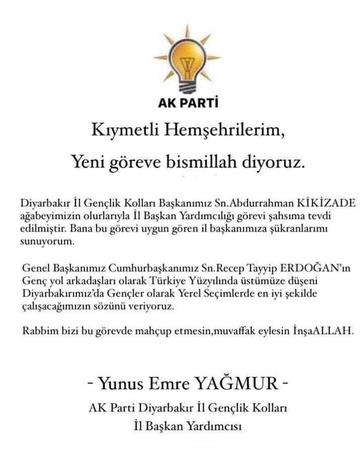 Göreve Atanan Sn. Yunus Emre Yağmur Kamuoyuna Açıklamada Bulundu. Ak Parti Diyarbakır İl Gençlik Kolları Başkan Yardımcısı Sn Yunus Emre Yağmur; Kıymetli Hemşehrilerim, Yeni göreve bismillah diyoruz. Diyarbakır İl Gençlik Kolları Başkanımız Sn. Abdurrahman KİKİZADE ağabeyimizin olurlarıyla İl Başkan Yardımcılığı görevi şahsıma tevdi edilmiştir. Bana bu görevi uygun gören il başkanımıza şükranlarımı sunuyorum. Genel Başkanımız Cumhurbaşkanımız Sn. Recep Tayyip ERDOĞAN'ın Genç yol arkadaşları olarak Türkiye Yüzyılında üstümüze düşeni Diyarbakırımız'da Gençler olarak Yerel Seçimlerde en iyi şekilde çalışacağımızın sözünü veriyoruz. Rabbim bizi bu görevde mahçup etmesin, muvaffak eylesin İnşaALLAH. Yunus Emre YAĞMUR - AK Parti Diyarbakır İl Gençlik Kolları İl Başkan Yardımcısı